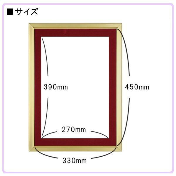 OA賞状用紙サイズの、壁掛け専用フレームです。 製造国:日本 素材・材質:フレーム:アルミ、前面:透明シート(PET)、台紙 重量:約400g 仕様:規格:OA賞状A3(台紙窓サイズ:270mm×390mm/紙サイズ:330mm×450mmまで)ゴールド枠:エンジ台紙シルバー枠:紺台紙壁掛け専用 付属品:紐 ※サプライヤー直送品 ご注文後13~17営業日後の出荷となります【商品名】A.P.J. Eフレーム(賞状サイズ) OA賞状額A3(270×390mm) ゴールド・1000008571
