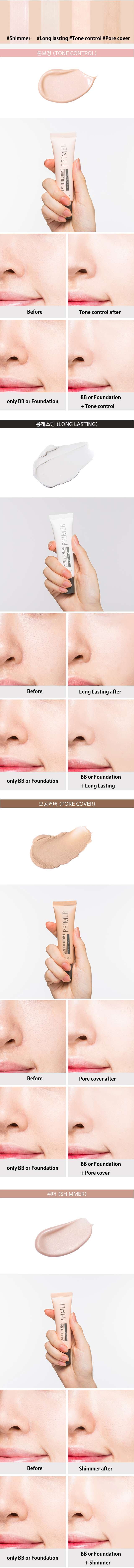 # Long Lasting : It helps keep makeup lasting hours. # Pore Cover : Condensation makes the skin smooth. # Shimmer : It will neatly sum up the skin.. # Tone Control : Condensation makes the skin lively.