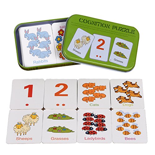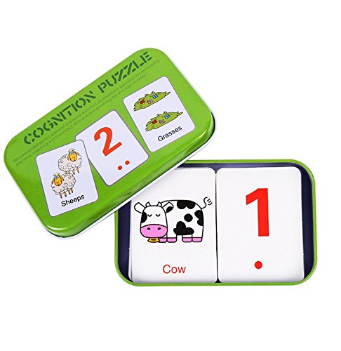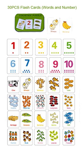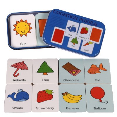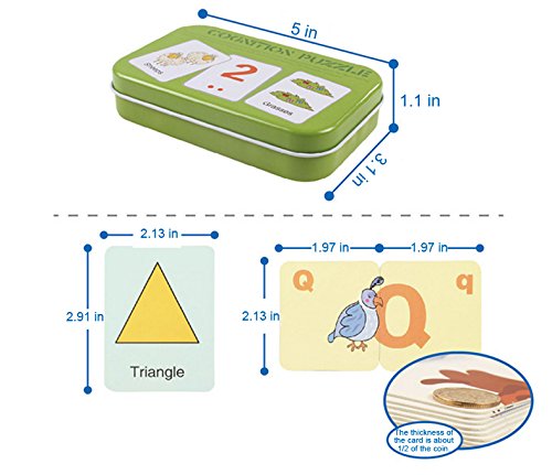 TWO-SIDES: made of anti-tear paper, very durable for kids to use. Card has image and simple word in one side, one the other side of the card, there is a simple puzzle/shape match. Only one half of the image, baby needs to find out the other half of the image, then the card is finished. This small game is fun to kids too.