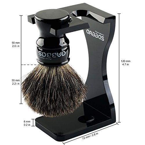 Specification: Diameter of Brush Handle Knot/Bottom: approx. 2.6/3.5cm-1.02/1.38 inch Opening for Brush/Razor: 3/1.6cm-1.18/0.63 inch Stand: acrylic,6mm thickness, mold making process, broken-resistant Bowl: black large resin shaving cup, diameter 4.1 inch Shaving Soap: goat milk from New Zealand, 100g