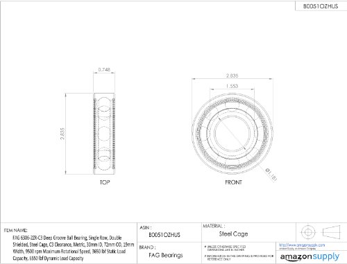 FAG 6306-2ZR-C3 Deep Groove Ball Bearing, Single Row, Double Shielded, Steel Cage, C3 Clearance, Metric, 30mm ID, 72mm OD, 19mm Width, 9500 rpm Maximum Rotational Speed, 3650 lbf Static Load Capacity, 6550 lbf Dynamic Load Capacity