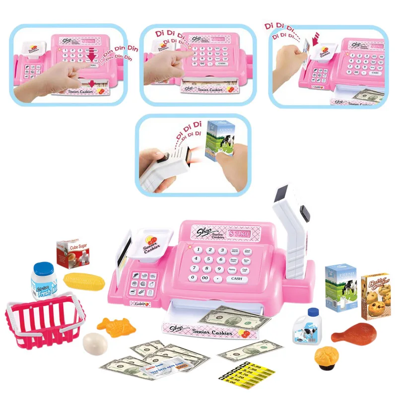 3.It will play music, when cash register toy install three batteries No.5 and touch the cash register button, you need buy battery by yourself.