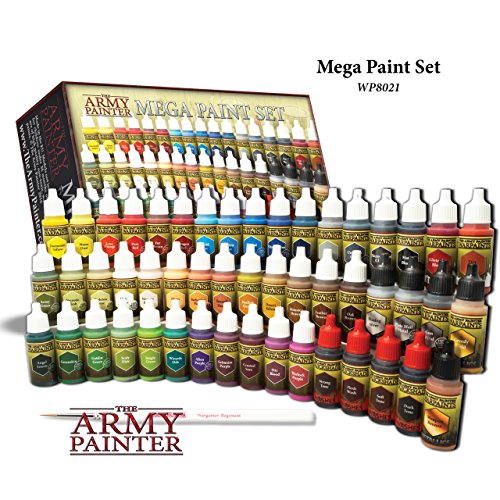 The Army Painter Mega Paint Set 3 has 5 Metallic Warpaints, 39 Acrylic Warpaints, 4 Quickshade Washes, 2 Effects Warpaints and 1 Triangular handled Regiment Brush.