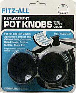 Studio : Tops MFG. CO., Inc. Publisher : Tops MFG. CO., Inc. Binding : Kitchen Product Description Fitz-All Replacement Pot Knobs with Finger Guards add safety while replacing lost or broken cover knobs on pots, pans, cookware. Wide diameter makes them comfortable to grip, while finger guards protect hands from contact with hot pot. Busy cooks can work quickly without fear of burned fingertips. Their size and the finger guards make these knobs suitable for the most demanding applications such as use on heat-generating appliances, wood stoves, etc. Made of heat-resistant Bakelite/phenolic with glossy black finish to complement any cookware. Dishwasher safe. Two knobs, two fingerguards, and two rustproof aluminum screws per set. 0