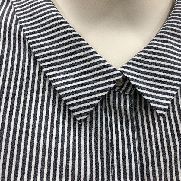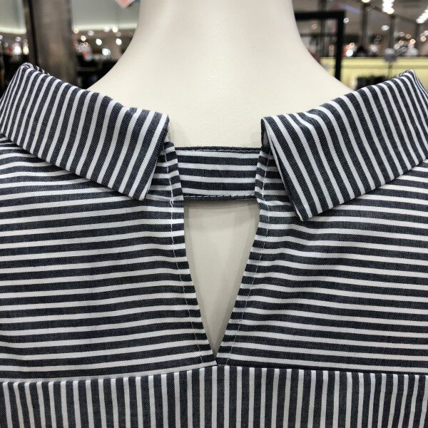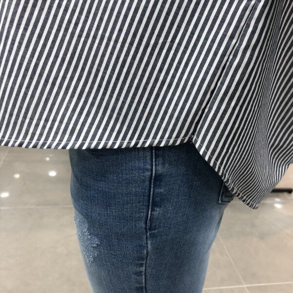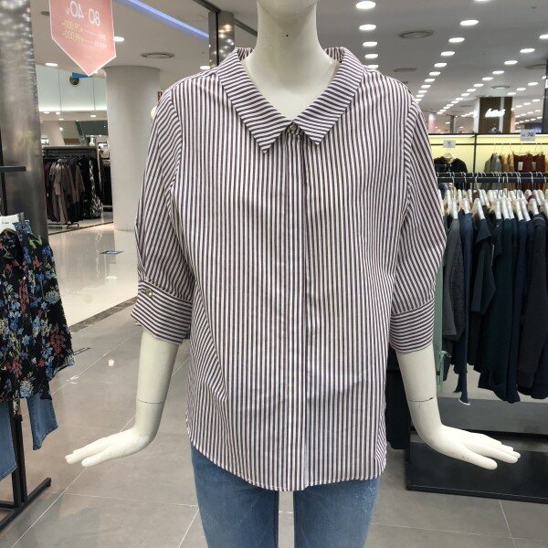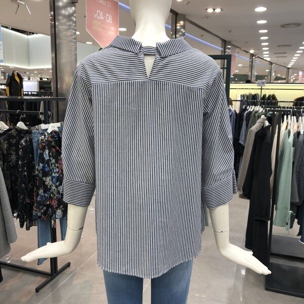 스트라이프 블라우스예요,7부 퍼프소매가 특징이고,뒷목 부분 장식이 있어 멋스럽게 입을수있어요,