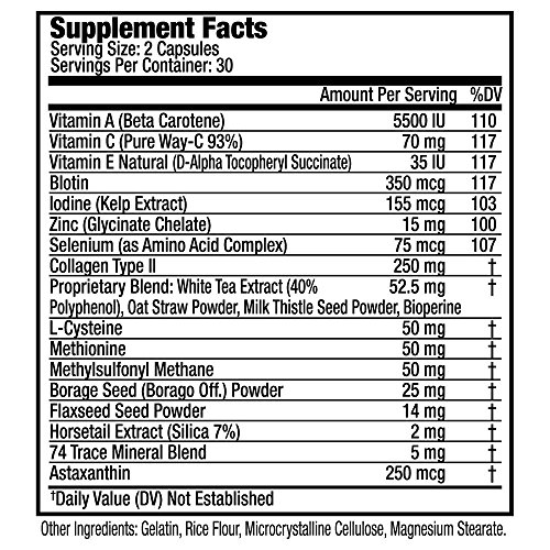 -. Feature : AGE-FIGHTING ANTI-OXIDANTS: Contains antioxidant Vitamins C, Vitamin E and White Tea Extract, which help protect skin cells and destroy free-radical damage caused by toxins in the environment and UV rays from the sun. / PROVIDES PRO-OXIDANT SELENIUM: Offers the pro-oxidant Selenium, which is an essential trace mineral that activates the glutathione peroxidise antioxidant. Selenium has been shown to help reduce oxidative stress that can lead to cell DNA damage. / INCREASES STRENGTH OF HAIR, SKIN, AND NAILS: Provides Biotin, Zinc and 74 trace minerals to support the structure and production of healthy hair, skin and nail tissue. / SUPPORTS SKIN COLLAGEN REJUVENATION: Provides the structural protein Type II Collagen or hyaluaronic acid, which supports skin cell rebuilding, and MSM, as a natural source of sulphur to help rebuild skin tissue. / PROVIDES ESSENTIAL FATS FOR SHINY, LUSTROUS, AND LONG HAIR: Supplies essential oils Borage and Flax Seed Oil, along with the amino acids Methionine and Cysteine that promote hair growth.
