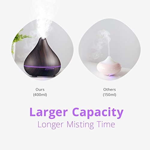 Larger Capacity Longer Misting Time: Holds up to 400ml (13.6 ounces) of water, this ultrasonic essential diffuser could cover humidification area up to 269sq.ft, a much larger range than others'. It runs 9 hours in low mist mode, 7 hours in high mist mode continuously