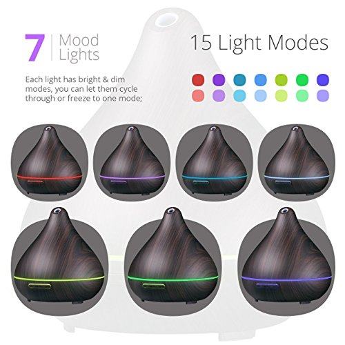 Stunning Color Display This 400ml essential oil diffuser is designed with 7 custom colors which are carefully selected, including red, yellow, green, cyan, blue, purple and white. Each color has bright and dim modes.