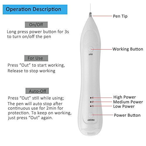 - [3 Power Outputs]: Freckle remover pen has 3 adjustable scan spot power outputs for different treatment, which is reliable, useful and convenient. 1st level for small age spot, mole removal; 2nd level for middles area; 3rd level for keloid scars removal.