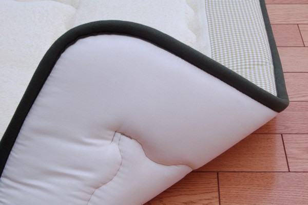 表地にはタオル地の綿生地を使用しています。綿は繊維の中でも特に肌触りが良いのが特徴で、季節を選ばずオールシーズンご使用頂けます。中材にはクッション性にこだわった国産の固綿40mmを使用しています。十分な弾力性があるのでフローリングでのご使用にも最適です。遮音特級LL-30を取得しています。床下への騒音も軽減します。また、こたつと併用するとこたつの熱を床下へ逃しにくくなるので省エネ効果もあります。