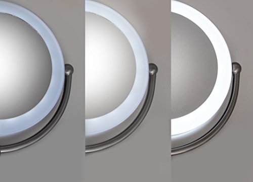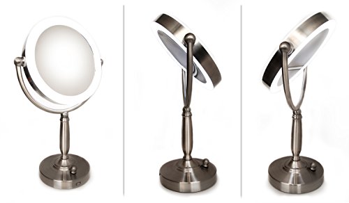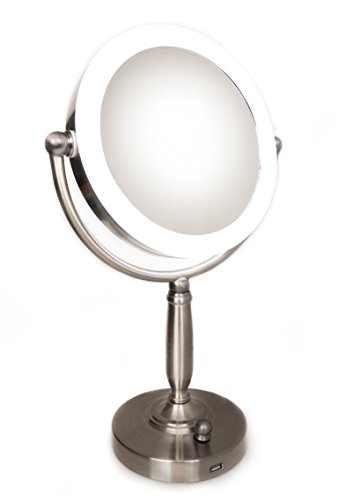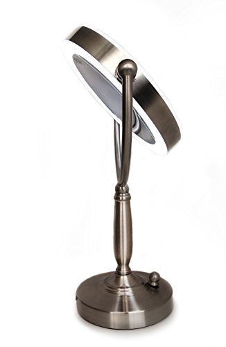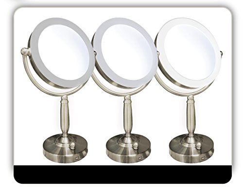 Led light desktop/stand mirror 1x/10x plastic frame 8.6"D. Dimmer knob transitions-dim light-daylight-super bright.360 swivel control. USB port