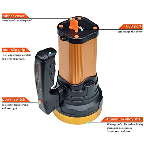 Super Bright 2200 Lumens.2 gear setting:Stand Brightness,High Brightness,Designed for Outdoor: Weatherproof IP64 & the extremely lightweight build allow you to take your Spotlight on and go with ease.