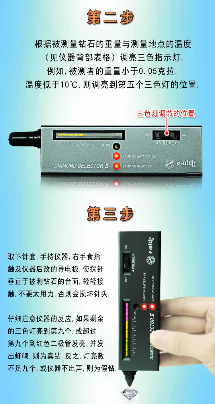 5, carefully watched the instrument's reflection, if the remaining yellow light-emitting diodes light, when lit to nine diodes, and accompanied by a beep that shows that the measured person is true diamonds. On the contrary, if the light is less than 9, and the instrument does not issue a sharp sound, that fake diamonds or counterfeit goods.