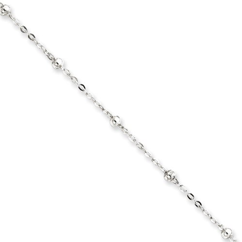 Accessorize your ankles with a shiny bracelet that looks great alone or layered. This 1mm cable chain is accented with 3mm polished beads and is made from glistening sterling silver. It is 9 inches in length and fastens with a spring ring clasp. Made in ItalyFeature