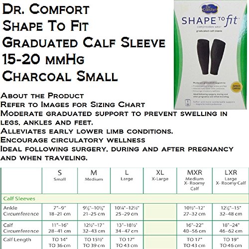 -. Brand : Dr. Comfort -. Color : Charcoal -. Feature : Refer to Images for Sizing Chart / Moderate graduated support to prevent swelling in legs, ankles and feet. / Alleviates early lower limb conditions. / Encourage circulatory wellness / Ideal following surgery, during and after pregnancy and when traveling. -. Label : DRC -. Manufacturer : DRC -. MPN : 710 -. PartNumber : 710 -. ProductGroup : Health and Beauty -. ProductTypeName : PERSONAL_CARE_APPLIANCE -. Publisher : DRC -. Studio : DRC -. Title : Shape to Fit Graduated Calf Sleeve 15-20 mmHg