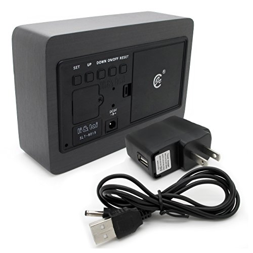 JCC New Wooden Series Modern Mini Rectangle Wood Grain Calendar Thermometer Activated Desk Super Soft Night Light LED Digital Alarm Clock (Black Wood - White LED)