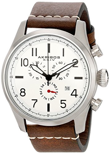 -. Binding : Watch -. Brand : Akribos XXIV -. Department : mens -. EAN : 0848572034456 -. Feature : Stainless steel watch featuring white easy-to-read dial with three subdials and small date window at four o'clock / 47 mm stainless steel case with mineral dial window / Swiss quartz movement with analog display / Leather calfskin band with buckle closure / Water resistant to 50 m (165 ft) -. IsAdultProduct : 0 -. Label : Akribos XXIV -. Manufacturer : Akribos XXIV -. Model : AK705BR -. MPN : AK705BR -. PackageQuantity : 1 -. PartNumber : AK705BR -. ProductGroup : Watch -. ProductTypeName : WATCH -. Publisher : Akribos XXIV -. ReleaseDate : 2014-04-21 -. Studio : Akribos XXIV -. Title : Akribos XXIV Men's AK705BR Ultimate Stainless Steel Watch with Brown Leather Band -. UPC : 848572034456