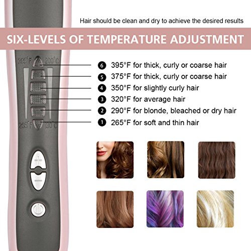 - SIX FLEXIBLE LEVELS TO ADJUST TO YOUR HAIRSTYLE NEEDS: Six (6) levels of heating temperatures can be chosen to fit various hair conditions. Our special design, with 23 ceramic heating elements, allows the comb to quickly contact a large portion of the hair at one time. With the 6 different temperature controls and the evenly dispersed heat, professional-looking results can be achieved easily and quickly.
