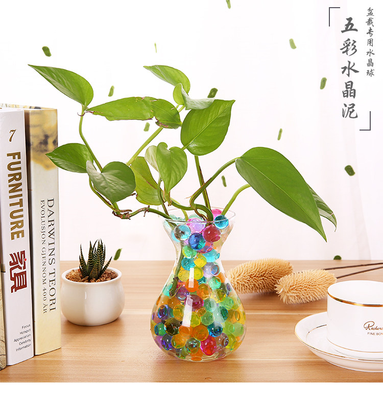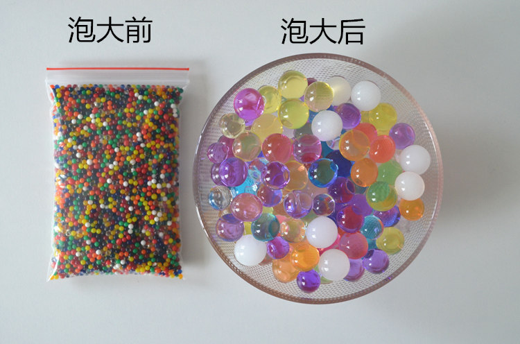 2、好看:晶莹剔透,特别漂亮!五颜六色的小水晶珠,放到水中就会慢慢长大,非常神奇!把它放入玻璃瓶中,放置桌上或装饰架上,一道亮丽的风景线!