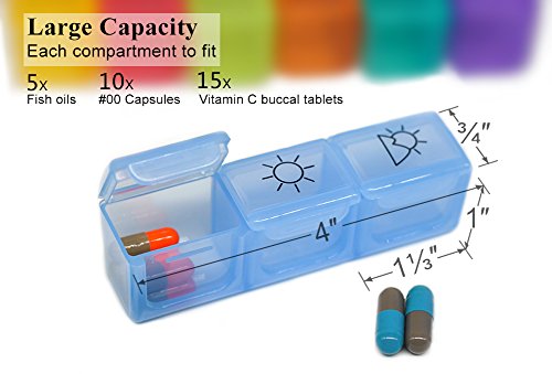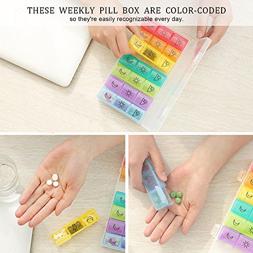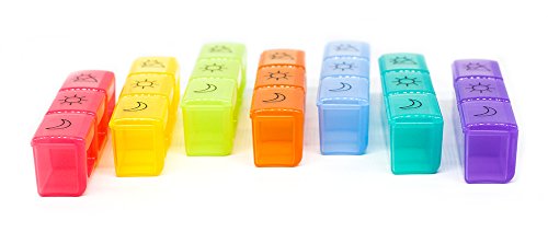 - THESE WEEKLY PILL BOX ARE COLOR-CODED, so they're easily recognizable. Each one has three compartments for your medicine