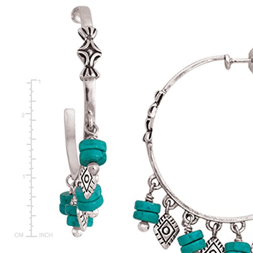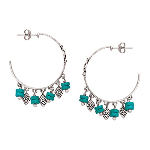 Boasting alternating drops of turquoise-hued beads and diamond-shaped sterling silvering details, these hoops make a statement all their own. Go for a Southwest look by coordinating the Dive In Earrings with cool neutrals, like creams and tans, or add them to yellows and corals for a fun, summery feel. Earrings measure 1 1/2 by 1/8 inches and feature post with friction back back-findings. Piece comes with a ".925" sterling silver stamp as a symbol of guaranteed product quality.