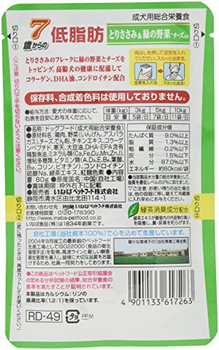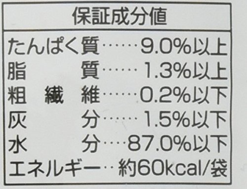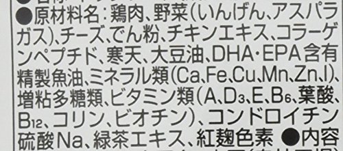 原材料:鶏肉(ささみ)、野菜(いんげん、アスパラガス)、チーズ、大豆油、でん粉、コラーゲンペプチド、寒天、DHA・EPA含有精製魚油、ミネラル類(Ca、Fe、Cu、Mn、Zn、I)、増粘多糖類、ビタミン類(A、D3、E、B6、葉酸、B12、コリン、ビオチン)、コンドロイチン硫酸Na、緑茶エキス、紅麹色素