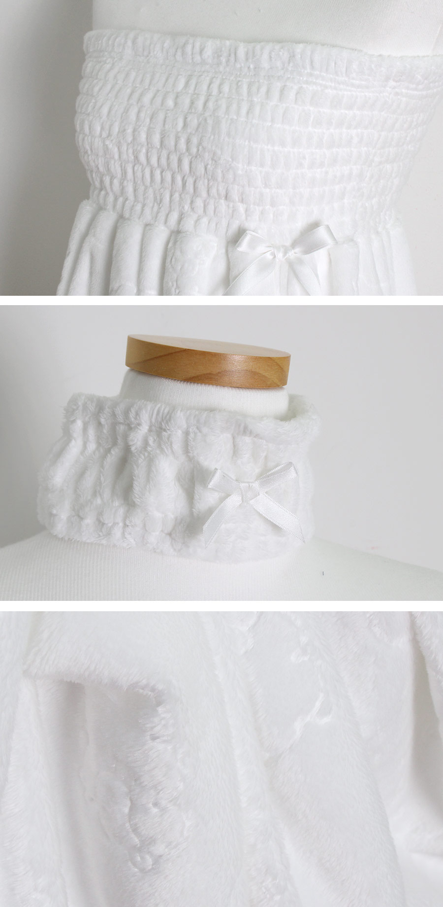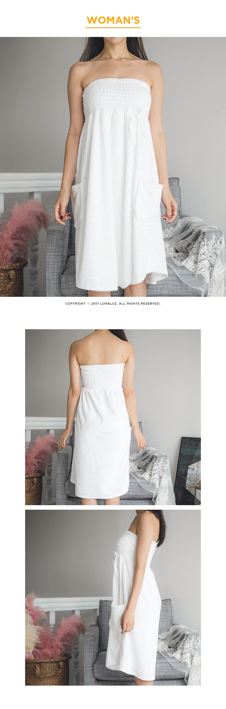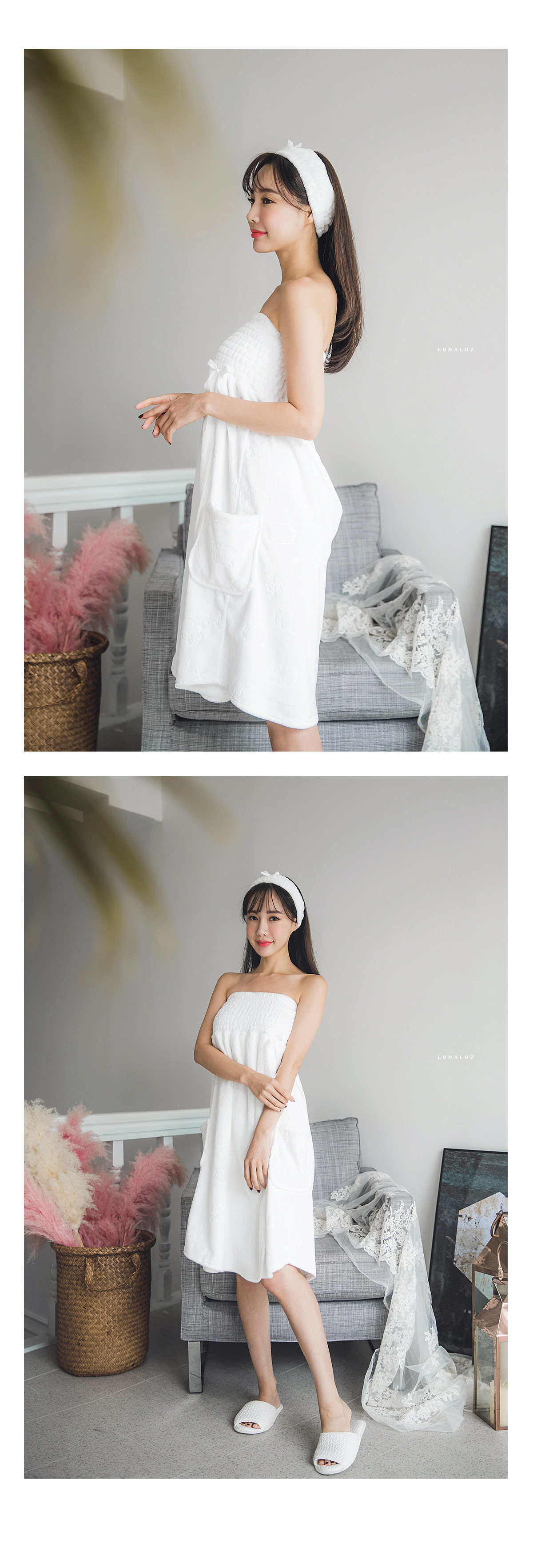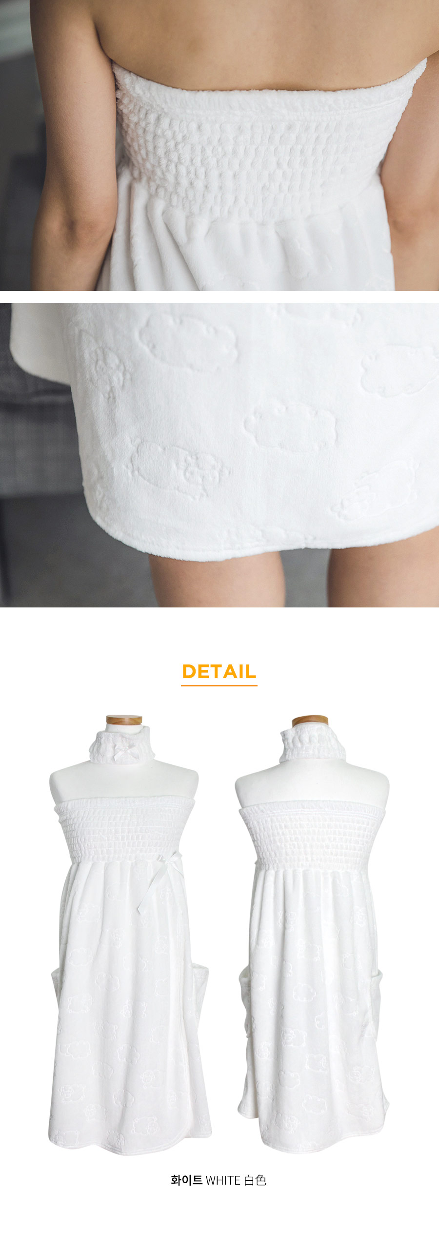 양면 극세사 원단으로 퀄리티가 높고, 스모킹 디자인이 매력적 이에요~! 양면 초극세사 원단으로 도톰하고 피부에 닿는 터칭감이 굉장히 좋습니다. 보온성이 좋고, 밍크극세사 원단, 양털극세사, 보아극세사 원단보다는 부피가 작지만 깔끔하게 떨어지는 느낌이 고급스러우며 심플한 느낌이 더한 겨울 원단입니다. 양면으로 촘촘하게 박힌 초극세사 털들로 보온성이 높고, 퀄리티가 좋아 냄새가 없고, 털빠짐이 적습니다. 고급스러운 텍스쳐로 분명 만족해 하실거에요.^^ 스탬프로 찍은 듯한 귀여운 양이 포인트가 되어 러블리해요~! 컬러는 깔끔한 화이트, 부드러운 핑크 컬러 2가지로 구성해 봤습니다. 극세사 원단의 특성상, 처음에 컷팅된 털들이 나오기 때문에 탈탈 털어 물 세탁 하시기 바랍니다:> DETAIL넓은 스모킹 디테일과 랩 디자인의 조화로 세심하게 제작한 랩가운 입니다. 스모킹을 넓게 쳐 안정감 있게 잡아주고, 그 밑으로 랩 디자인을 응용해 디자인했습니다. 안정감 있게 덮어주는 랩 디자인으로 원단 소요량을 대폭 늘려 세심하게 작업했습니다. 바스트부터 하단까지 매력 있게 떨어지는 자체 패턴으로 착용시, 편안하고 실루엣을 훨씬 예쁘게 살려줍니다. 리본 디테일이 잘 어우러져 여성스러운 분위기를 한 층 더 살려줍니다. 세심한 부분까지 놓치지 않은 랩가운으로 적극 추천해드리고 싶습니다. 세안 밴드와 set 구성으로 활용도 높게 착용하실 수 있습니다. 100% 국내 제작으로 봉제, 소재의 마감이 깔끔하고 디자인의 퀄리티가 높습니다. SIZE평균 44반size~66size까지 커버 가능한 free 사이즈 입니다.