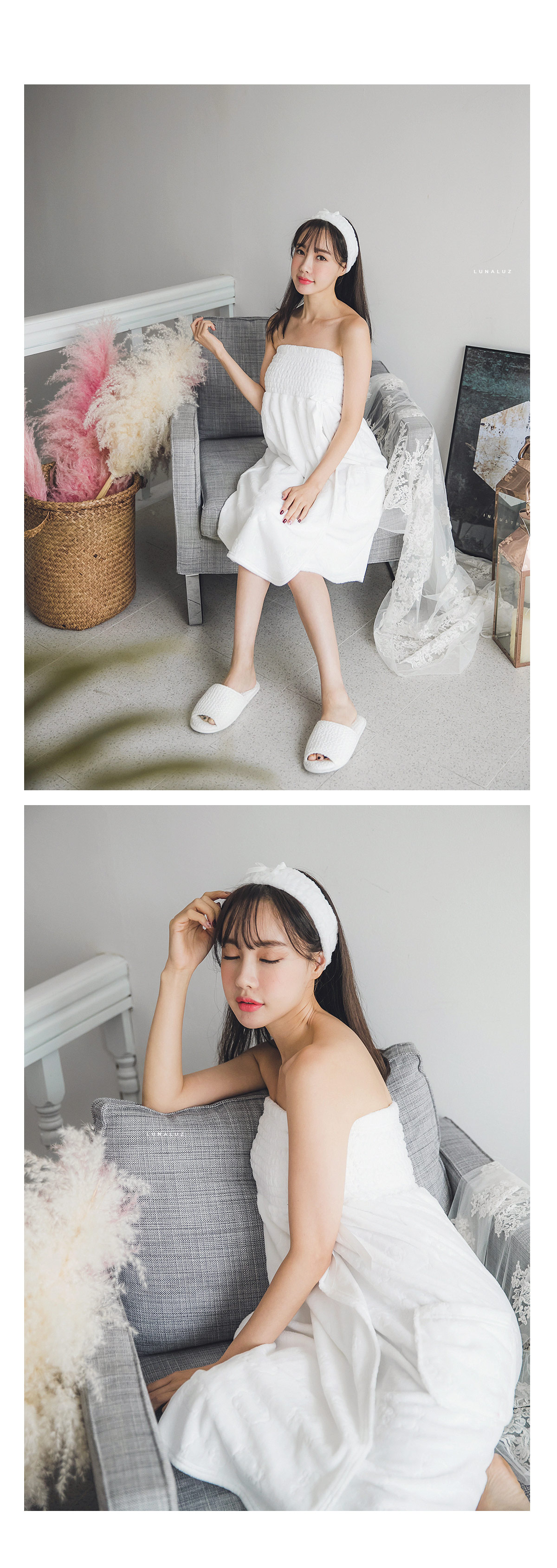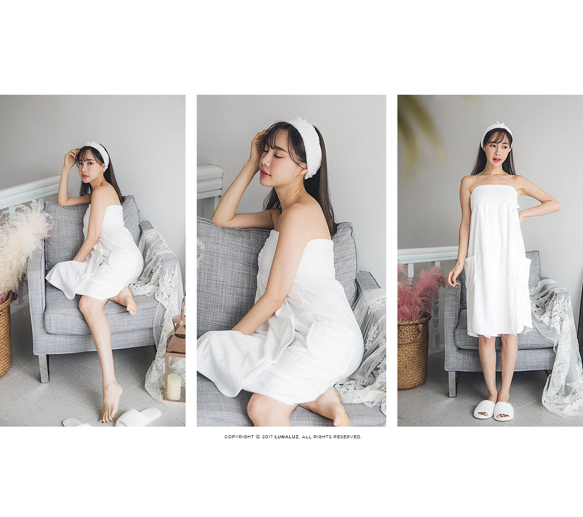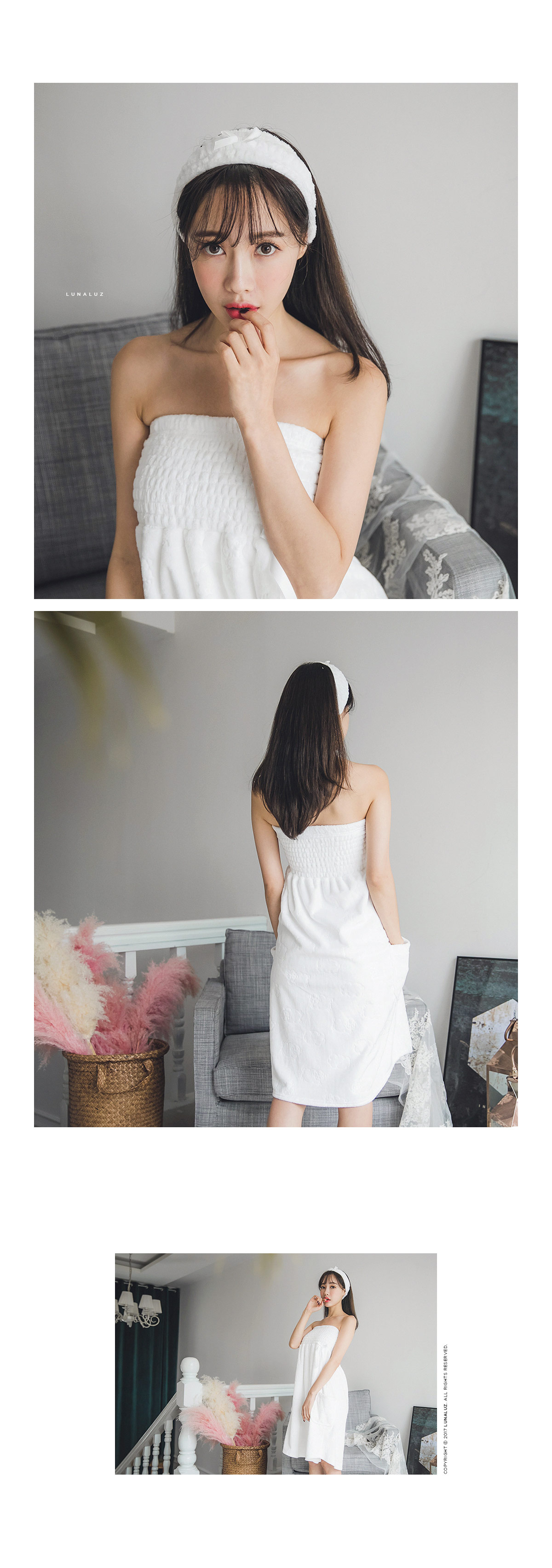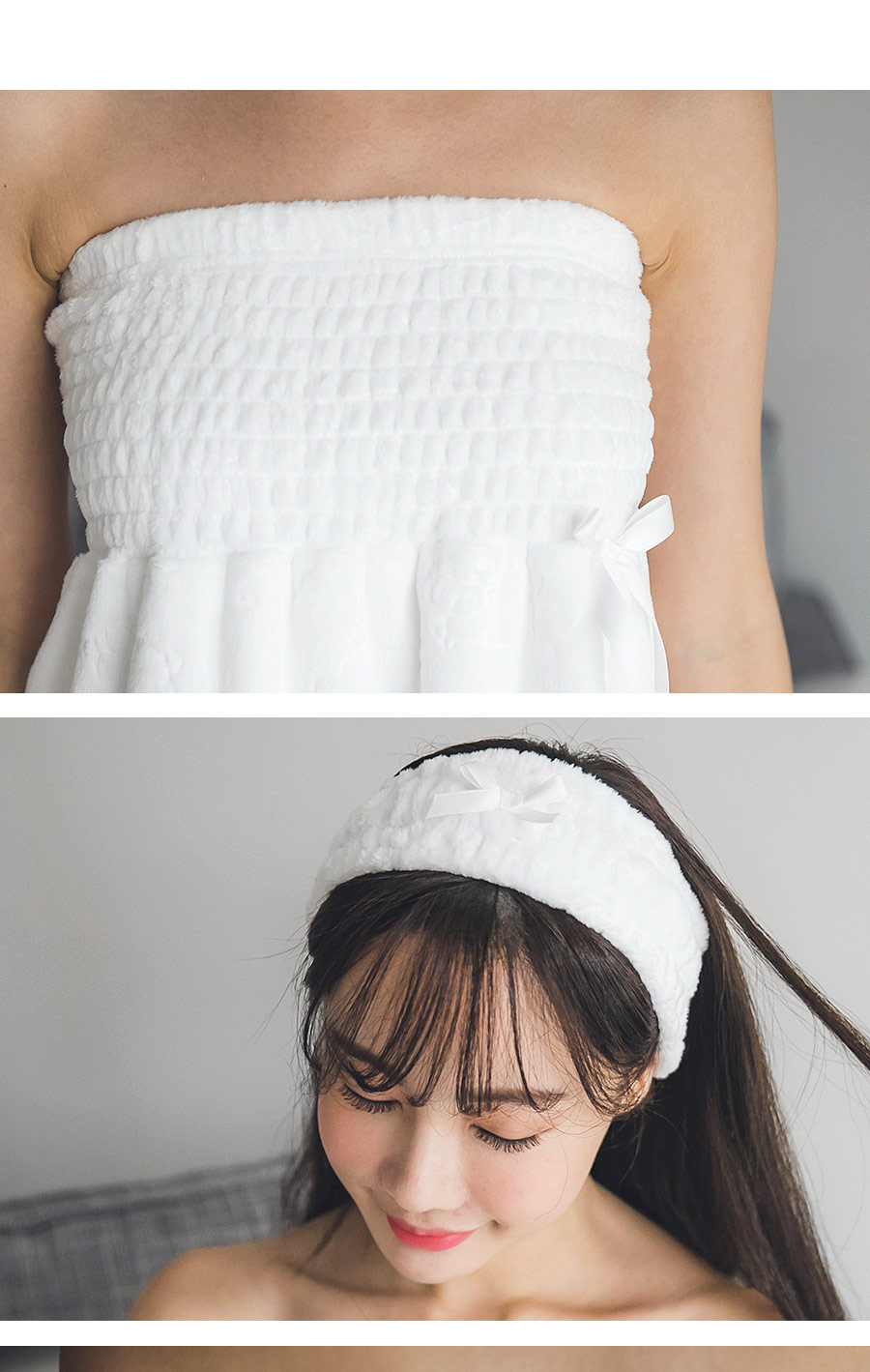 양면 극세사 원단으로 퀄리티가 높고, 스모킹 디자인이 매력적 이에요~! 양면 초극세사 원단으로 도톰하고 피부에 닿는 터칭감이 굉장히 좋습니다. 보온성이 좋고, 밍크극세사 원단, 양털극세사, 보아극세사 원단보다는 부피가 작지만 깔끔하게 떨어지는 느낌이 고급스러우며 심플한 느낌이 더한 겨울 원단입니다. 양면으로 촘촘하게 박힌 초극세사 털들로 보온성이 높고, 퀄리티가 좋아 냄새가 없고, 털빠짐이 적습니다. 고급스러운 텍스쳐로 분명 만족해 하실거에요.^^ 스탬프로 찍은 듯한 귀여운 양이 포인트가 되어 러블리해요~! 컬러는 깔끔한 화이트, 부드러운 핑크 컬러 2가지로 구성해 봤습니다. 극세사 원단의 특성상, 처음에 컷팅된 털들이 나오기 때문에 탈탈 털어 물 세탁 하시기 바랍니다:> DETAIL넓은 스모킹 디테일과 랩 디자인의 조화로 세심하게 제작한 랩가운 입니다. 스모킹을 넓게 쳐 안정감 있게 잡아주고, 그 밑으로 랩 디자인을 응용해 디자인했습니다. 안정감 있게 덮어주는 랩 디자인으로 원단 소요량을 대폭 늘려 세심하게 작업했습니다. 바스트부터 하단까지 매력 있게 떨어지는 자체 패턴으로 착용시, 편안하고 실루엣을 훨씬 예쁘게 살려줍니다. 리본 디테일이 잘 어우러져 여성스러운 분위기를 한 층 더 살려줍니다. 세심한 부분까지 놓치지 않은 랩가운으로 적극 추천해드리고 싶습니다. 세안 밴드와 set 구성으로 활용도 높게 착용하실 수 있습니다. 100% 국내 제작으로 봉제, 소재의 마감이 깔끔하고 디자인의 퀄리티가 높습니다. SIZE평균 44반size~66size까지 커버 가능한 free 사이즈 입니다.
