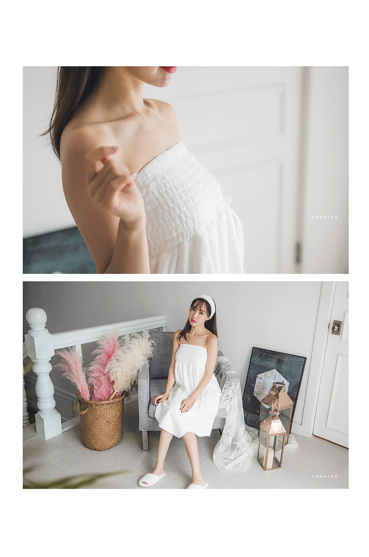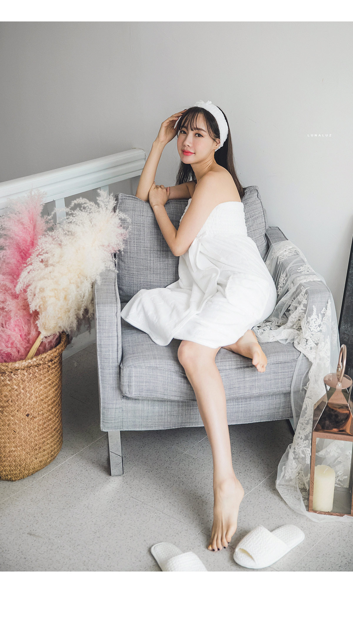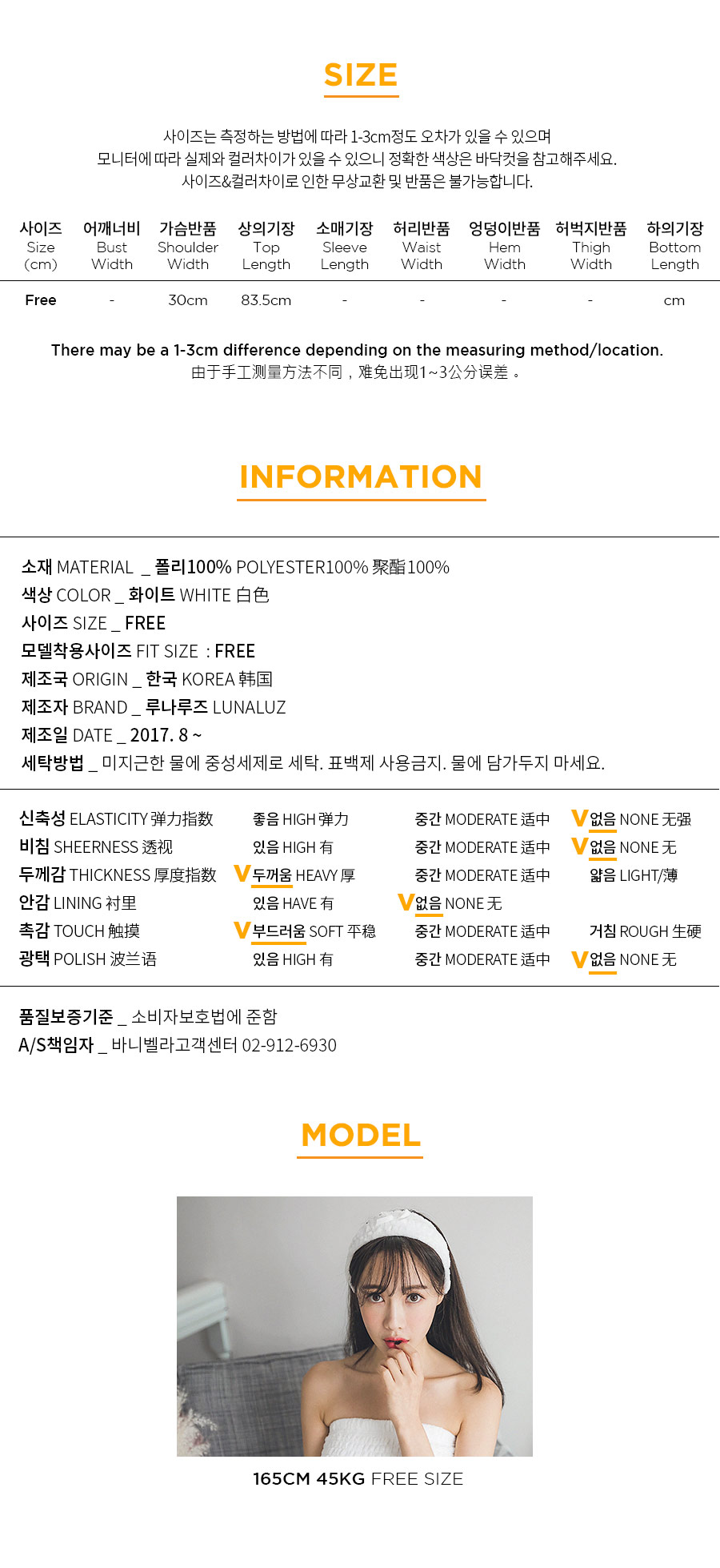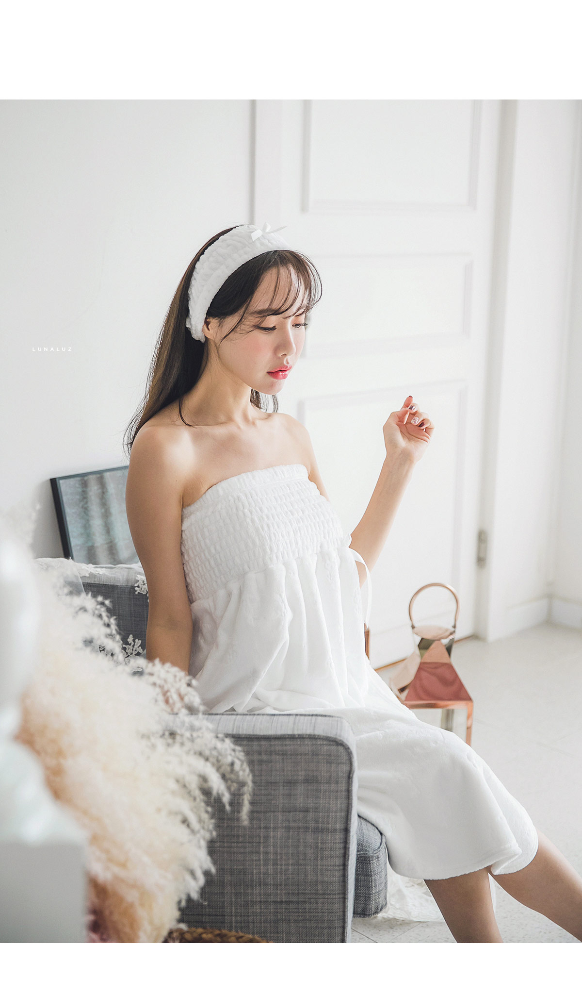 양면 극세사 원단으로 퀄리티가 높고, 스모킹 디자인이 매력적 이에요~! 양면 초극세사 원단으로 도톰하고 피부에 닿는 터칭감이 굉장히 좋습니다. 보온성이 좋고, 밍크극세사 원단, 양털극세사, 보아극세사 원단보다는 부피가 작지만 깔끔하게 떨어지는 느낌이 고급스러우며 심플한 느낌이 더한 겨울 원단입니다. 양면으로 촘촘하게 박힌 초극세사 털들로 보온성이 높고, 퀄리티가 좋아 냄새가 없고, 털빠짐이 적습니다. 고급스러운 텍스쳐로 분명 만족해 하실거에요.^^ 스탬프로 찍은 듯한 귀여운 양이 포인트가 되어 러블리해요~! 컬러는 깔끔한 화이트, 부드러운 핑크 컬러 2가지로 구성해 봤습니다. 극세사 원단의 특성상, 처음에 컷팅된 털들이 나오기 때문에 탈탈 털어 물 세탁 하시기 바랍니다:> DETAIL넓은 스모킹 디테일과 랩 디자인의 조화로 세심하게 제작한 랩가운 입니다. 스모킹을 넓게 쳐 안정감 있게 잡아주고, 그 밑으로 랩 디자인을 응용해 디자인했습니다. 안정감 있게 덮어주는 랩 디자인으로 원단 소요량을 대폭 늘려 세심하게 작업했습니다. 바스트부터 하단까지 매력 있게 떨어지는 자체 패턴으로 착용시, 편안하고 실루엣을 훨씬 예쁘게 살려줍니다. 리본 디테일이 잘 어우러져 여성스러운 분위기를 한 층 더 살려줍니다. 세심한 부분까지 놓치지 않은 랩가운으로 적극 추천해드리고 싶습니다. 세안 밴드와 set 구성으로 활용도 높게 착용하실 수 있습니다. 100% 국내 제작으로 봉제, 소재의 마감이 깔끔하고 디자인의 퀄리티가 높습니다. SIZE평균 44반size~66size까지 커버 가능한 free 사이즈 입니다.