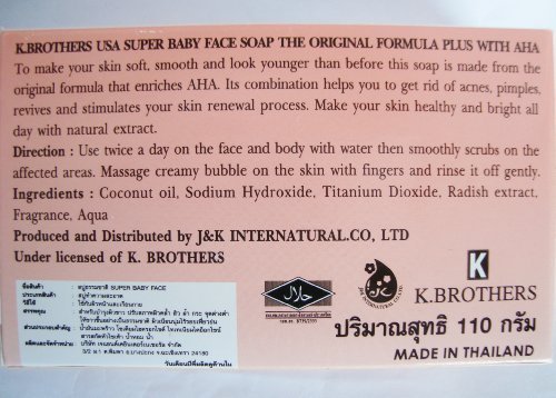 -. Binding : Misc. -. Brand : U.S.A. Super Baby Face -. EAN : 8853252009619 -. Feature : Super whitening soap with extreme whiteners / Contains alpha-hydroxy AHA whiteners / Clears acne and dark spots when used twice daily / Combines with titanium oxide and radish extract to enhance whitening / Natural astringent qualities clear oily skin, revealing fresh lively skin underneath! -. IsAdultProduct : 0 -. Label : K Brothers -. Manufacturer : K Brothers -. Model : NA -. MPN : NA -. NumberOfItems : 20 -. PackageQuantity : 1 -. PartNumber : NA -. ProductGroup : Beauty -. ProductTypeName : BEAUTY -. Publisher : K Brothers -. Studio : K Brothers -. Title : Super Baby Face AHA Whitening Soap 110g/3.9oz