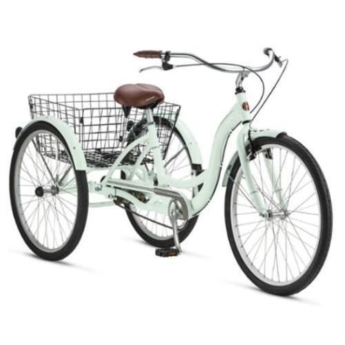 - Feature : This Adult Schwinn Tricycle is a 26" frame and comes with an attached shopping / beach basket. / Padded spring cruiser saddle absorbs bumps while rear folding basket safely stores belongings. / In Mint, Red Cherry, Silver or Blue this Adult Schwinn Tricycle is a sweet show stopping ride! / Wide upright handlebar for a stable, balanced ride on this three-wheeler / Your sure to turn heads while cruising along the beach's boardwalk on this Adult Schwinn Tricycle!