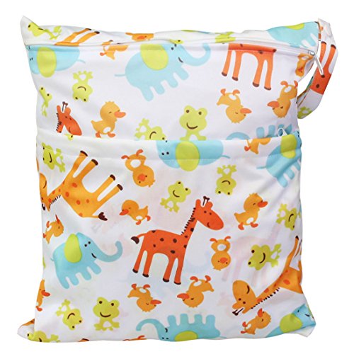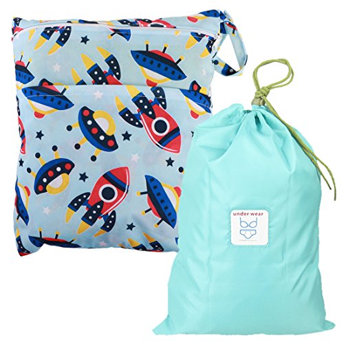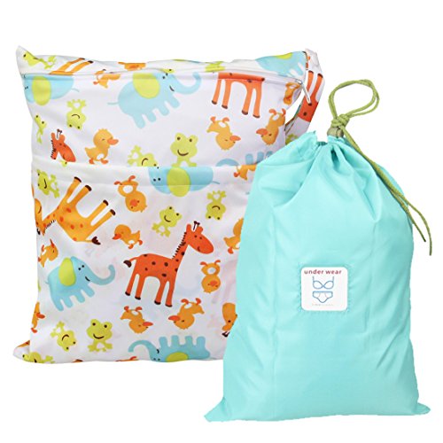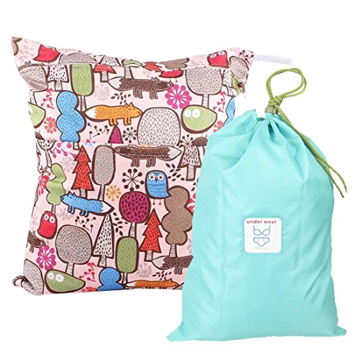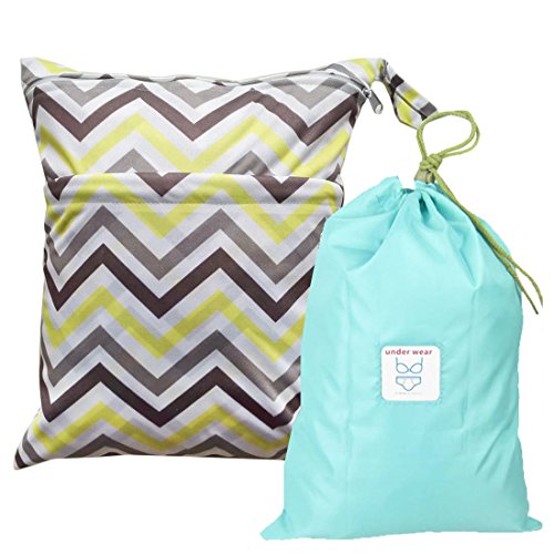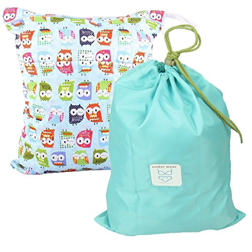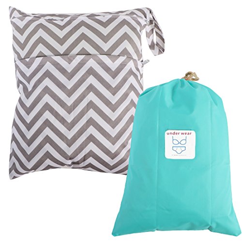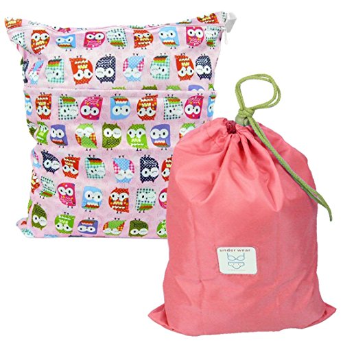 Product Description Are you on the go looking for efficient travel storage system for items such as swimsuits, dirty/clean clothing, or even cosmetic products?? Or are you a busy mom looking for better ways to store wet/dry baby clothing or dirty/clean cloth diapers? ?Look no further!? This travel kit comes with a waterproof bag and a multipurpose bag.? The waterproof two-in-one wet bag features two built-in zipper pockets, for easy separation of wet (such as swim suits, wet cloth diapers/baby clothes) and dry/clean items.? The drawstring bag comes with interchangeable card insert system for easy identification of contents (with pre-printed labels for tee, pants, underwear, laundry, socks and shoes). Waterproof wet bag size: 12.25"W x 14.25"L Drawstring bag size: 10"W x 14.25"L 0