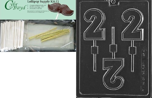 Cybrtrayd Number 2 Lolly Letters and Numbers Chocolate Candy Mold with Lollipop Supply Bundle of 25 Gold Twist Ties