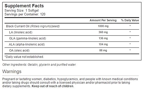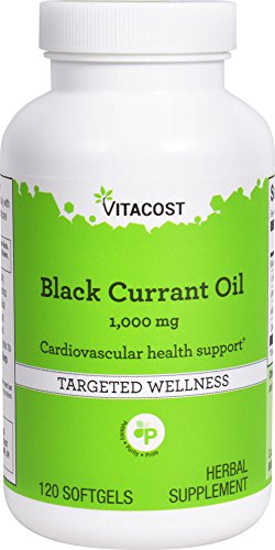 Natural source of both omega-3 essential fatty acid alpha linolenic acid (ALA) and omega-6 gamma linoleic acid (GLA). Promotes cardiovascular health.* What is black currant oil?Black currant oil is extracted from seeds of the black currant plant, a shrub with large, maple-like leaves and purplish-black berries that grows throughout the midwestern U.S.Black currant oil is a natural source of omega-3 essential fatty acid (EFA) alpha linolenic acid (ALA), and it's also one of nature's best sources of omega-6 gamma linoleic acid (GLA). GLA is primarily present in plant fats including borage oil, evening primrose oil and black currant oil. GLA cannot be synthesized by the human body and must be obtained through diet.How does black currant oil support health?Supplies EFAs, which are beneficial for many aspects of health. GLA (found in black currant oil) is converted in the body to DGLA, a precursor in the production of prostaglandins. Prostaglandins are hormone-like compounds involved in a variety of normal body functions.May support a healthy immune system.*Supports joint comfort and mobility.*Promotes cardiovascular health.* Why choose Vitacost Black Currant Oil?Supplies 1,000 mg of black currant oil per 1-softgel serving.Each bottle contains 120 servings. Exceptional quality at an extraordinary value.About VitacostVitacost nutritional products are manufactured to high standards of quality, efficacy and safety. Each Vitacost product meets or exceeds the standards and requirements set forth in the FDA's Code of Federal Regulation (21 CFR, 111) Current Good Manufacturing Practices (CGMP).*These statements have not been evaluated by the FDA. This product is not intended to diagnose, treat, cure or prevent any disease.Feature