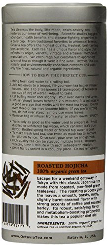 -. Binding : Grocery -. Brand : Octavia Tea -. EAN : 0893574001777 -. Feature : Escape to Tokyo for a weekend getaway with this classic Japanese tea / 1.87-ounce loose tea tin / 100% natural green tea, USDA certified organic / Brew green teas carefully in order to get the best taste and maximum flavor / Brought to you by Octavia tea company--a company which thinks of tea as an escape from the ordinary / Net weight (per tin): 1.87 ounce (53 g) / Japanese green tea; roasted green tea / High in antioxidants and health promoting properties / 187-ounce loose tea tin -. Label : Octavia Tea -. Manufacturer : Octavia Tea -. NumberOfItems : 1 -. PackageQuantity : 1 -. ProductGroup : Grocery -. ProductTypeName : GROCERY -. PublicationDate : 2010-10-28 -. Publisher : Octavia Tea -. Size : 1.87 Ounces -. Studio : Octavia Tea -. Title : Octavia Tea Roasted Hojicha (Organic Green Tea), 1.87-Ounce Tin -. UPC : 893574001777