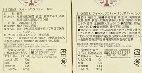 原材料:【桜花】塩漬桜花加工品(塩漬桜花、酒精)、桜葉エキス(酒精、塩漬桜葉)、クエン酸 【ほうじ茶】茶(日本)、桜葉エキス(酒精、塩漬桜葉)、乾燥塩漬桜葉、乾燥塩漬桜花、ミョウバン