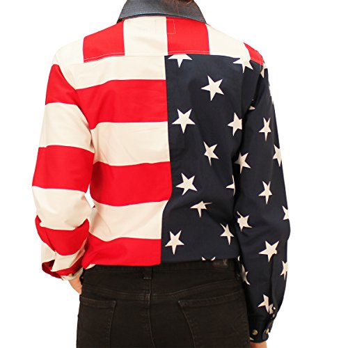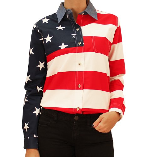 Binding : Apparel Product Description This long sleeves, full button down, 100% woven cotton, mens patriotic flag shirt features the American flag with horizontal red and white stripes on the front bottom, top left, and left sleeve, and navy blue backgorund with white stars on the top right and right sleeve. The back also features one side of red and white horizontal stripes and the blue background with white stars representing the states on the other side. Finished with a contrasting denim collar. It doesn't get more patriotic than this! You would be wearing the the American Flag, perfect for 4th of July, Veterans Day, Memorial Day, Tea Party or other patriotic events. You would be wearing a piece of history. 0