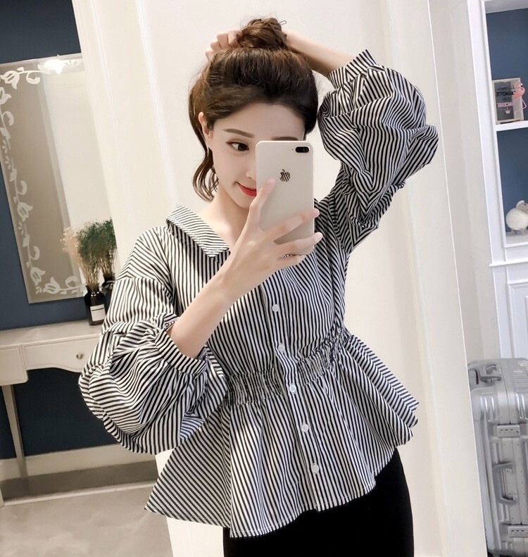ふんわりとした裾や袖が女性らしく可愛らしい雰囲気の長袖Vネックシャツです。