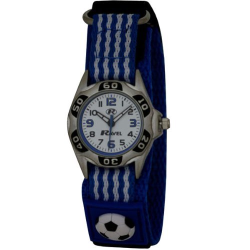 Football Crazy Boys Watch Round Polished Chrome Sports Case Featuring A Imitation Top Ring. White Dial With Black/Bue Printed Numbers. Black And White Luminous Hands With Blue Second Hand. Black Nylon Strap Featuring Blue And White Stripes With A Blue/Black/White 3D Football Badge. Quality Quartz Movement. Packaging-Luxury Black Gift Box