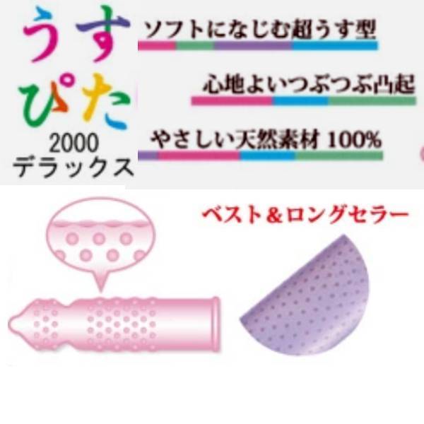 ■販売元:ジャパンメディカル株式会社 ■管理医療機器(男性向け避妊用コンドーム) ■医療機器製造販売認証番号 219AFBZX00113000、219AFBZX00114000コンドーム コンドーム イボ ・この商品は定形外郵便で送料が無料です。 ・ご自宅郵便受けへの投函で配達は完了です。 ・お届け日及び時間帯の指定は不可です。 ・お届け時に若干箱潰れの可能性があります。 ・宅配便扱い商品との同梱は宅配便送料が加算されます。 ◆上記ご納得の上ご購入願います。 「うすぴた」シリーズはうす型フィット! どれもうすさと自然な感触にこだわり、超うす型なのに強度にすぐれ、多数の粒状凸起と一段絞りでフィット感アップ。 女性のお肌をいたわる天然ゴム100%、化学物質を避け天然素材のみを使用し、ナイーブな女性のお肌へを配慮しました。 【セット内容】 ◆エクセレント(12個入 定価¥2625) ・超薄型 ・2段しぼり ・多数のつぶ状 ◆デラックス(12個入 定価¥2100) ・うすがた ・1段しぼり ・多数のつぶ状 (避妊具 スキン こんどーむ ごむ ゴム つぶつぶ ツブツブ メール便 代引き可 代引可 代金引換可 代金引き換え可)