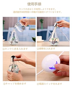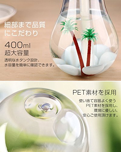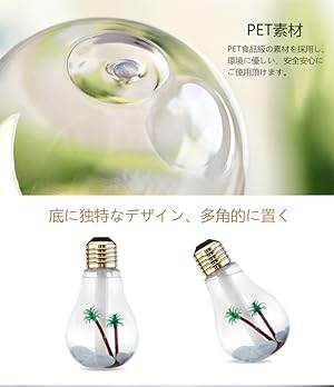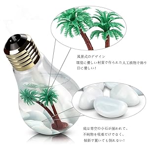 おしゃれな電球式デザインの低騒音の加湿機です。環境に優しい素材で作られて、綺麗な人口植物と小石が飾り付けて、目に優しい、気分良くなるし、落ち着くことができます。インテリアとしても快適なアイテムです。透明でいつでも中身の水量を観察することができます。