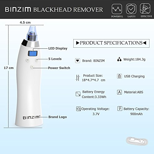 -. Feature : Electric Blackhead Remover: A revolutionary new facial care product aims to clean blackhead more effective. Popular product, Most wish for and Best gift in 2018. / Safe and Painless: Compare with blackhead mask which might causes skin allergy, Electric blackhead remover is more safely. Made with good ABS, skin friendly. In addition, Clean Blackhead Painless, after applied BINZIM electric blackhead remover, you don't want experience traditional blackhead extractor tool and blackhead mask again. / How it works: Clean blackhead in a physical way, non irritant, Electric blackhead remover vacuum blackhead and massage skin. Powerful suction get blackhead out. What's more, this products helps you tightens pores. Effective, Safe ,Non-irritant, your best choice! / Gift for fourteen years and up. Tighten pores, Clean blackhead, Acne remover, Facial treatment, Facial Massage. / Note: Move along one direction when using, do not stay in on place more than 3 seconds. DO NOT start with a high intensity, recommend starting with 1-2 intensity. Please contact our customer service if you don't know how to use.
