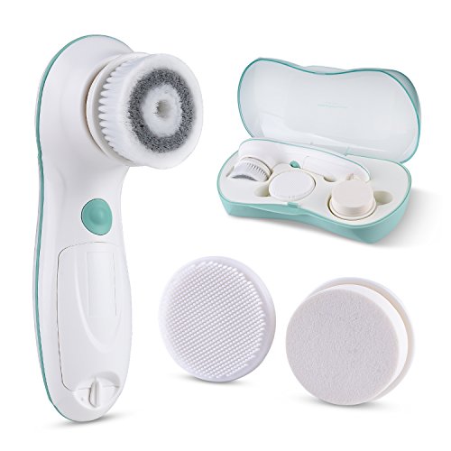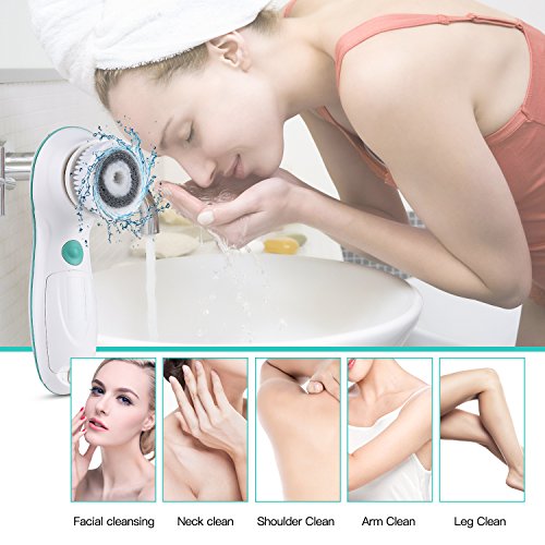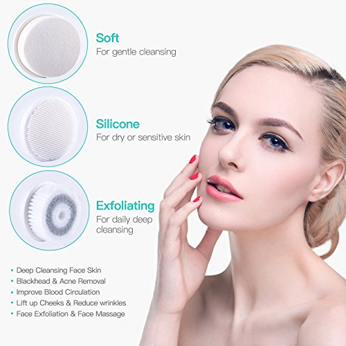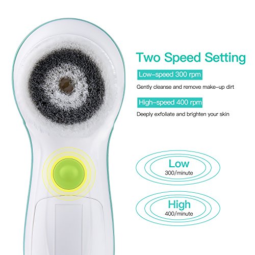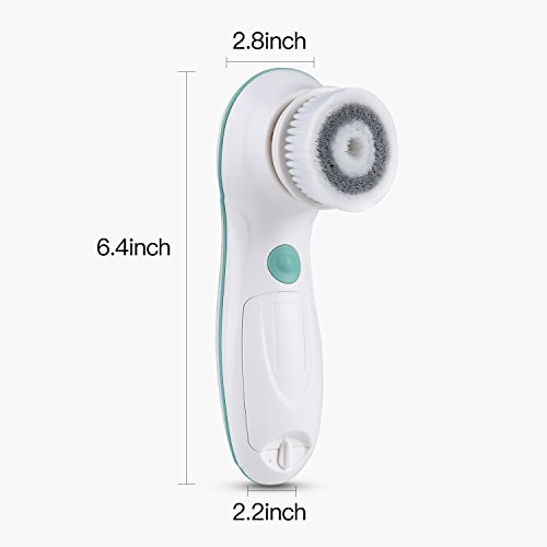 -. Feature : FULLY WATERPROOF- IPX6 water resistant in the bath or shower. Cordless facial spin brush powered by 2 AA Batteries (not included). / A COMPLETE FACE AND BODY CLEANSING SYSTEM - Advanced microdermabrasion scrub system removes make-up, dirt, oil from pores; reduces fine lines and wrinkles; clears blackheads and prevent acne; renews your skin texture. / A FULL RANGE OF ATTACHMENTS - 3 brush heads (includes 1 silicone head) and a protective travel case to meet all your facial cleansing needs. / TWO-SPEED MOTOR DELIVERS THOROUGHLY CLEANSES - High and low speeds for different cleaning tasks - It tackles blemishes and clogged pores in order to advance skin's elasticity and collagen production. It also helps remove blackheads and whiteheads, and effectively reaches hard to clean areas like the sides of your nose and t-zone. / SOFT NYLON BRISTLES ARE GENTLE ON YOUR FACE - Suitable for all skin types: normal, dry, oily, sensitive.