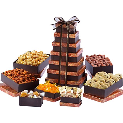 -. Feature : Great gift for birthday, thinking of you, or any occasion / Perfect gift basket for family and friends, or as a corporate office gift. / Gift tower includes: Brown & Haley Almond Roca (5pc), Vanilla Caramel Kiss Taffies (5.25oz), Honey Roasted Cashews (4oz), Butterscotch flavored candy discs (4.5oz), Botano Cajun Mix (4oz), Chocolate Chip Cookies (4oz), and Gourmet Caramel Popcorn (4oz) / GIFT TOWER DIMENSIONS: 6.5" x 6.5" x 15" / Kosher Certified OK D. Giving a kosher gift ensures that all recipients can enjoy and partake in your gift.