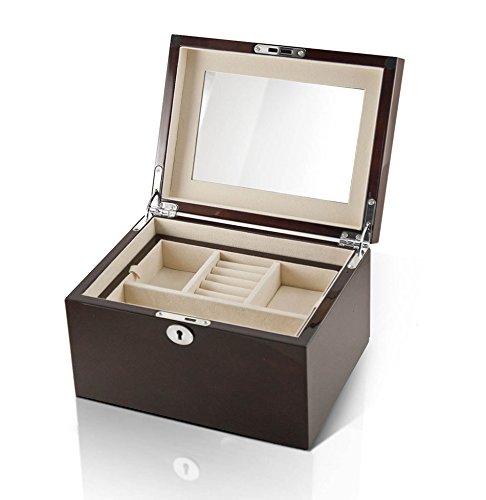 -. Feature : Tune: 18 note movement (please choose above option for available song titles) / Clean modern design with multiple compartments + lift up tray / Hi gloss coffee (brown) finish / Functional lock with key & pouch / Crème velvet interior with Large Mirror