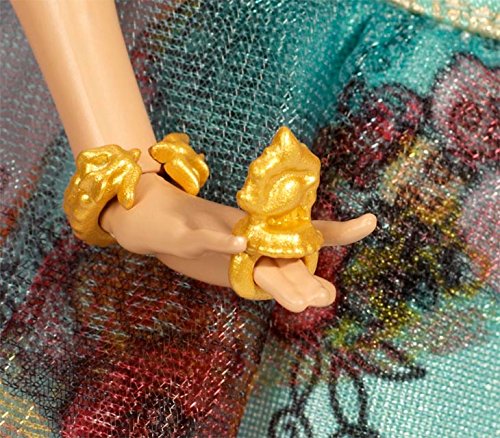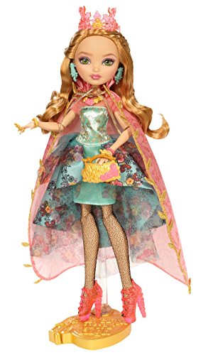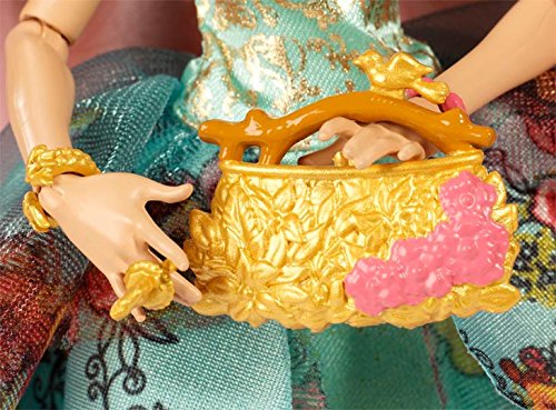 Ashlynn Ella doll is ready to spellebrate Legacy Day with a spellbinding dress that features a multi-colored floral print, layered ruffles over a fitted glittery skirt and a golden filigree bodice