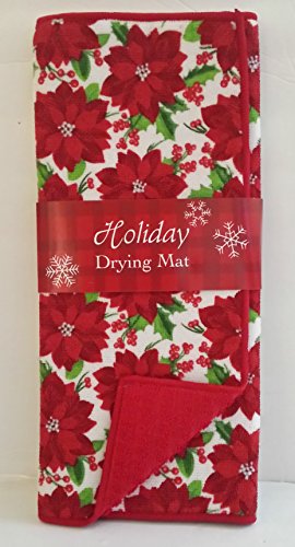- Reversible Dish Drying Mat Featuring Christmas Holiday Poinsettia Flowers on White Background. Other side is Red.