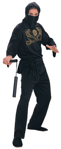 -. Binding : Apparel -. Brand : Rubie's -. Color : Black -. Department : mens -. Feature : Deluxe ninja costume includes scarf, hooded shirt, pants and matching waste sash / Twin cobra crest printed on the shirt / Why wait for Halloween - also great for stage, kids parties or one-on-one play time year round / One size fits most / Rubies Costume Company is a family owned business based in New York with more than 60 years of experience bringing children and adults the costumes and accessories they want to Halloween and year-round dress up -. Genre : Ninja/Martial Arts -. IsAdultProduct : 0 -. Label : Rubies Costumes - Apparel -. Manufacturer : Rubies Costumes - Apparel -. NumberOfItems : 1 -. ProductGroup : Apparel -. ProductTypeName : ADULT_COSTUME -. Publisher : Rubies Costumes - Apparel -. Studio : Rubies Costumes - Apparel -. Title : Rubie's Costume Deluxe Adult Ninja Costume