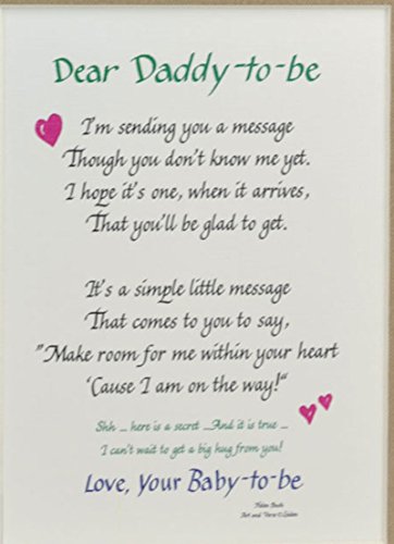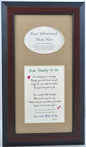 Studio : All Things for Mom Publisher : All Things for Mom Binding : Baby Product Product Description 7x14 Solid Wood American Made frame with sawtooth hook on back. Opening for photo is 3" H x 4.5" W. If your photo is smaller, you can mount it on cardstock (black looks nice). You can place this anywhere in your home. Poem Dear Daddy-to-be I'm sending you a message Though you don't know me yet. I hope it's one, when it arrives, That you'll be glad to get. It's a simple little message That comes to you to say, "Make room for me within your heart 'Cause I am on the way!" Shh... here is a secret... And it is true... I can't wait to get a big hug from you! Love, Your Baby-to-be (Poem written by Helen Bush Art Verse copyright Laura Leiden Calligraphy) 0