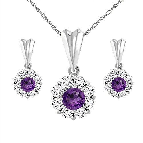 -. Title : 14K White Gold Natural Amethyst Earrings and Pendant Set with Diamond Halo Round 4 mm